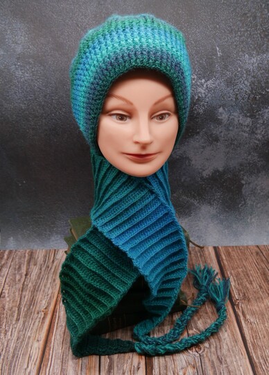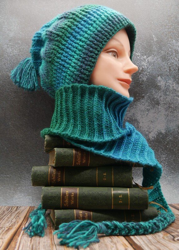 Der Beanie umschließt deinen Nacken, mit dem direkt mitgearbeiteten Schal. Diesen kannst du in Wunschlänge und -breite häkeln.