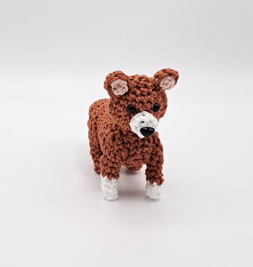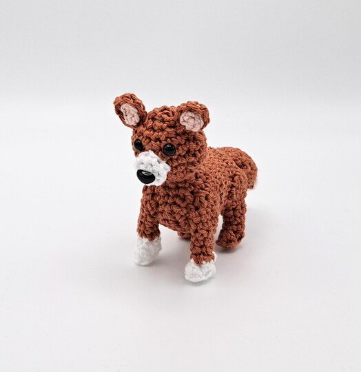 Mit einer Häkelnadel Stärke 2,5 und dem Garn Schachenmayr Catania (50 g / 125 m) wird das Tier ca. 7,5 cm hoch und 12 cm lang.