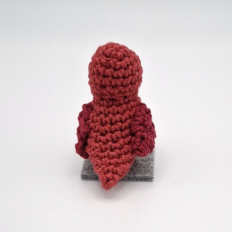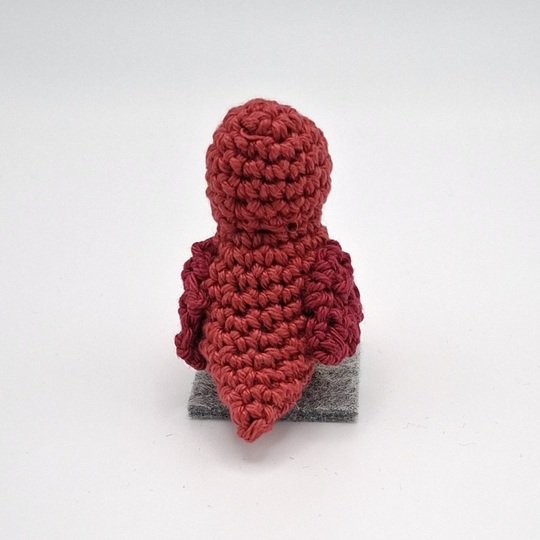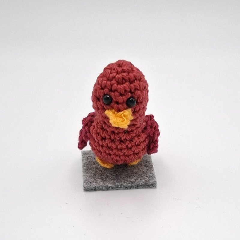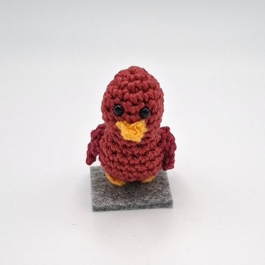 Mit einer Häkelnadel Stärke 2,5 und dem Garn Schachenmayr Catania (50 g / 125 m) wird das Tier ca. 5 cm groß an 6,5 cm lang.