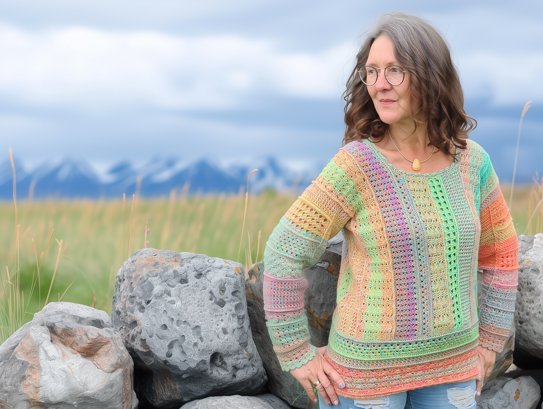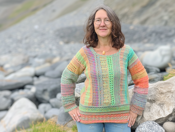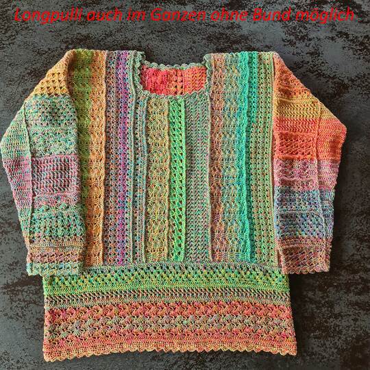 Lasst uns den Frühling mit einem kunterbunten Häkelpullover begrüßen: Ihr könnt ihn als Kurzpullover mit Bund oder auch als längere Variante ohne Bund häkeln. Kurzarm oder Langarm: beides ist möglich!