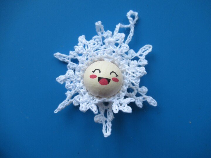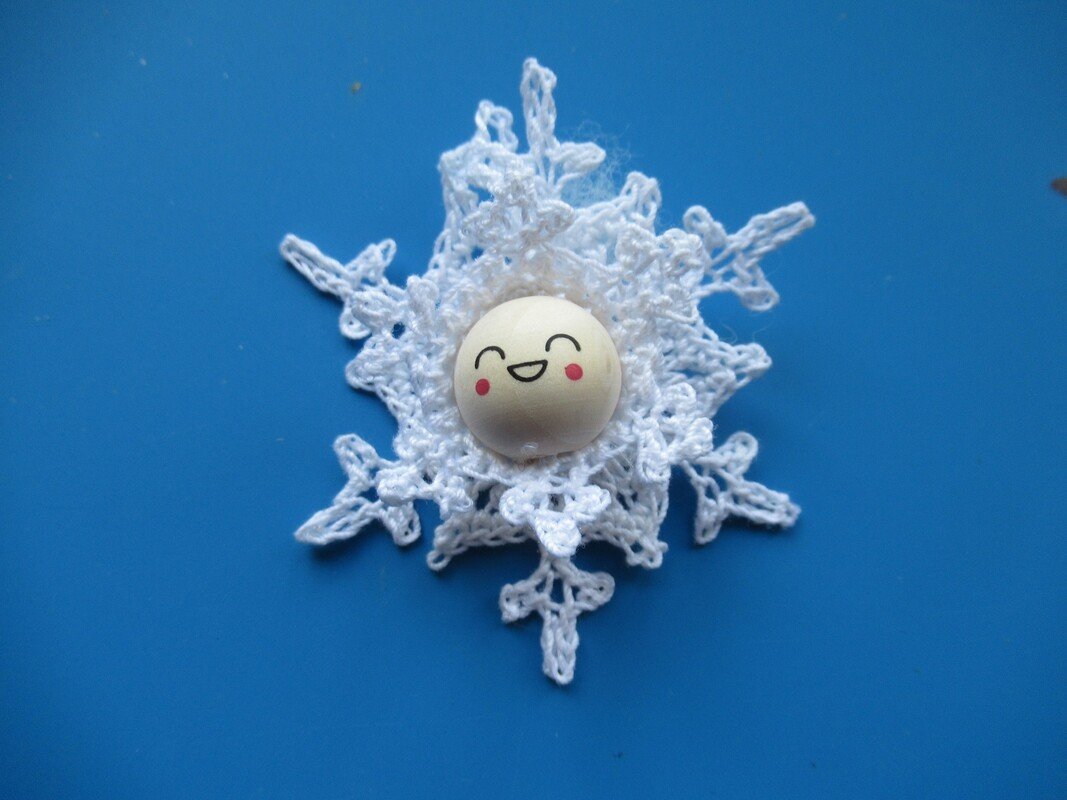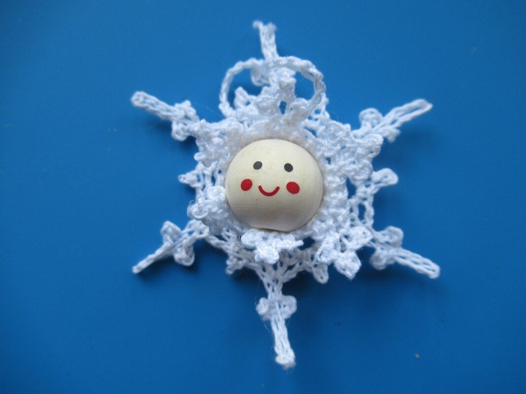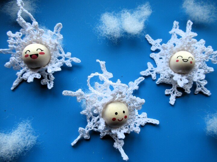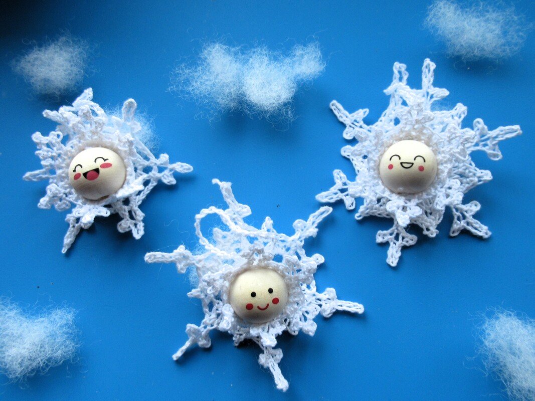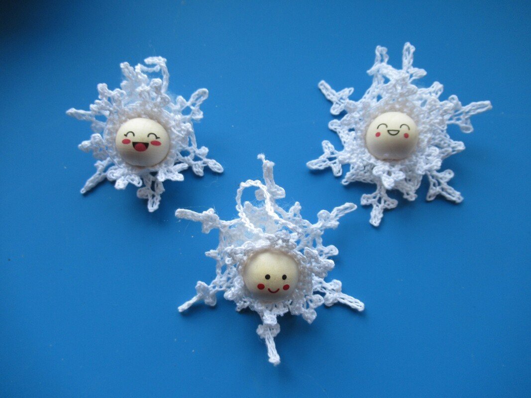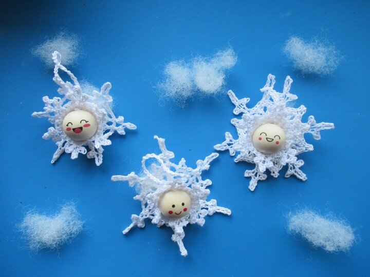 Die Schneeflöckchen-Anhänger bestehen aus dem Kopf mit Häubchen, der auf eine Schneeflocke genäht oder geklebt wird. Dadurch wirken sie sehr plastisch. Da ja in der Natur jede Schneeflocke einzigartig ist, kannst du auch hier unterschiedliche Schneeflocken für diese Anhänger arbeiten. Mit dieser Anleitung hast du die Möglichkeit, 3 verschiedene Schneeflöckchen-Anhänger zu häkeln.