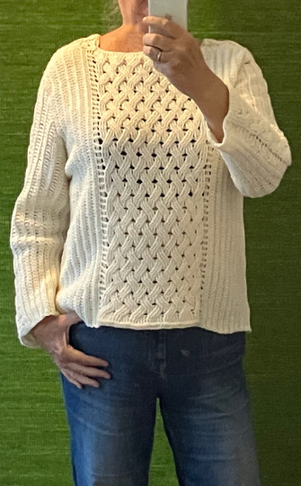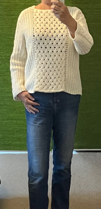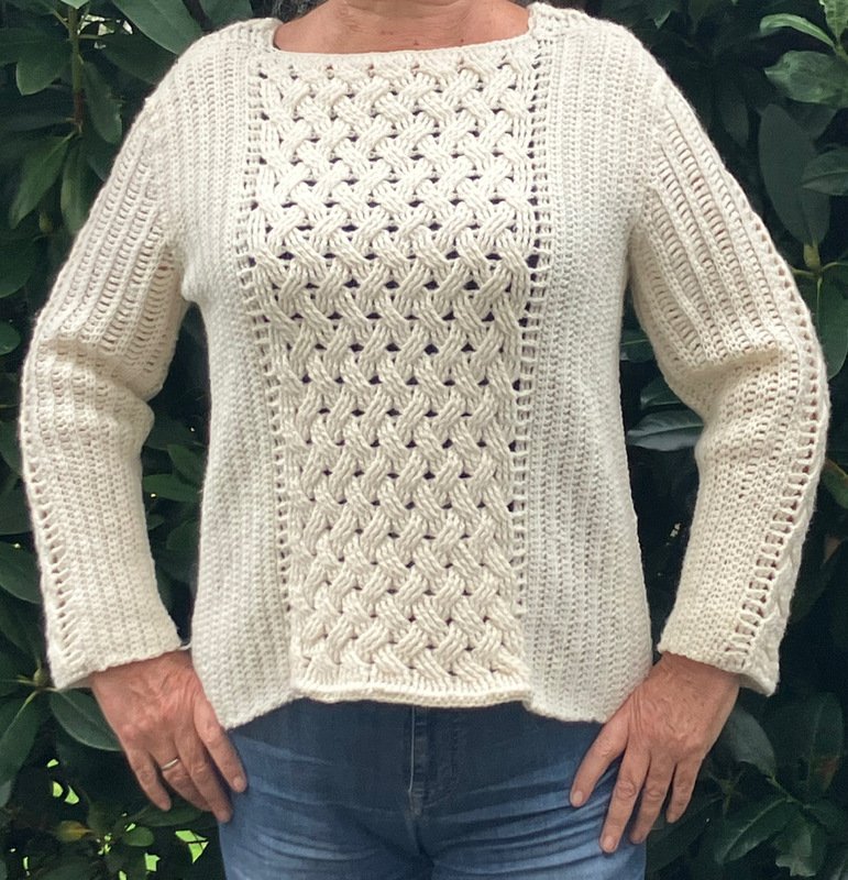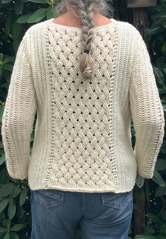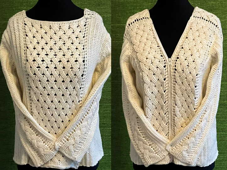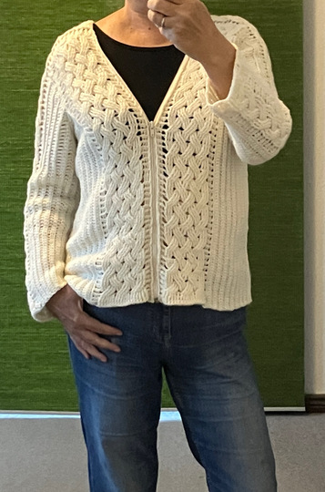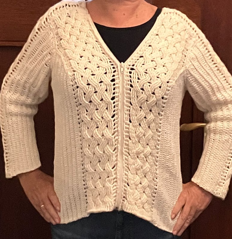 An dieser Jacke bzw. Pullover hab ich lange getüftelt, gefühlt 5 mal wieder aufgeribbelt. Aber jetzt bin ich mit meinem „Meisterstück“ ziemlich zufrieden. Das Problem war nicht das Zopfmuster, sondern das drum herum mit Armausschnitt und so weiter. Jetzt ist es so geworden, dass es leichter zu häkeln ist, als es aussieht. Vor allem der Pullover ist einfacher zu häkeln. Die Jacke erfordert einiges an Erfahrung mit dem Häkeln von Kleidung. Ich erkläre jedes Detail mit Häkelschrift und Text auf 30 Seiten mit vielen Fotos.