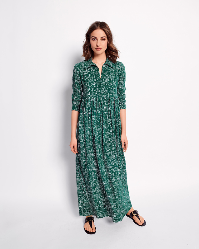 Ebenfalls mit Kragen aber in der extralangen Version mit langen Ärmeln und aus fließendem Pünktchen-Stoff genäht: Damit bekommt das Maxikleid einen eleganten femininen Vibe. Tipp: Wenn’s draußen noch etwas kühler ist einfach dicke Strümpfe Rolli und Boots dazu tragen. Sieht sehr cool aus!