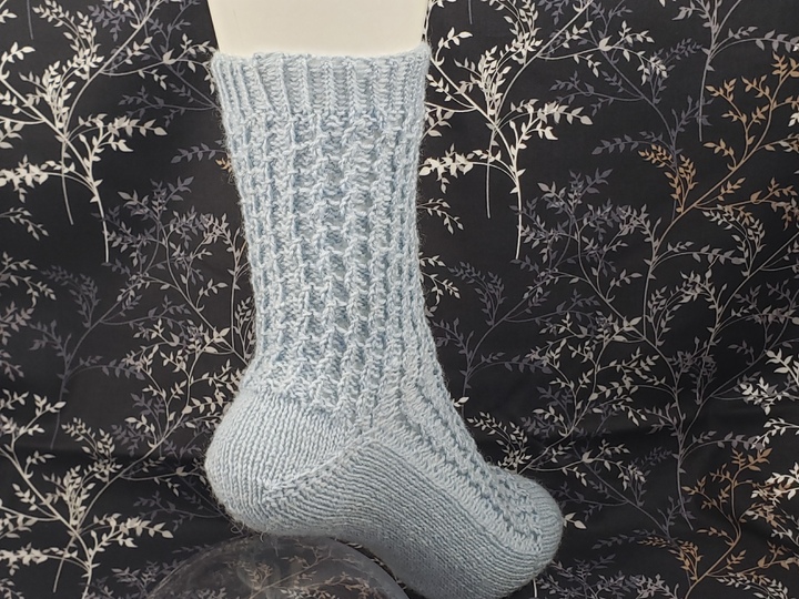 Du erhälst eine bebilderte Strickanleitung für ein Paar Socken mit einem hübschen Muster und Boomerang-Ferse.