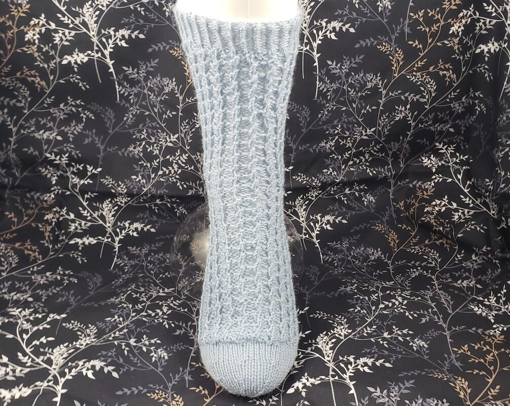 Die Socke wird mit Nadelspiel 3 mm gearbeitet und die Beispielanleitung passt Schuhgrößen 36/37.