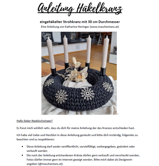 Die Anleitung wird mit einem 30cm Strohkranz gehäkelt, kann aber auf jede Größe adaptiert werden.