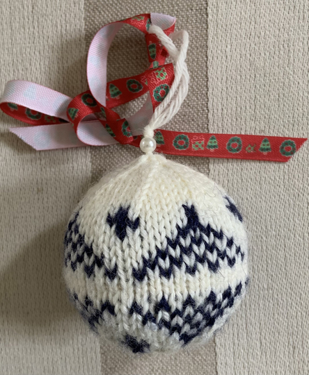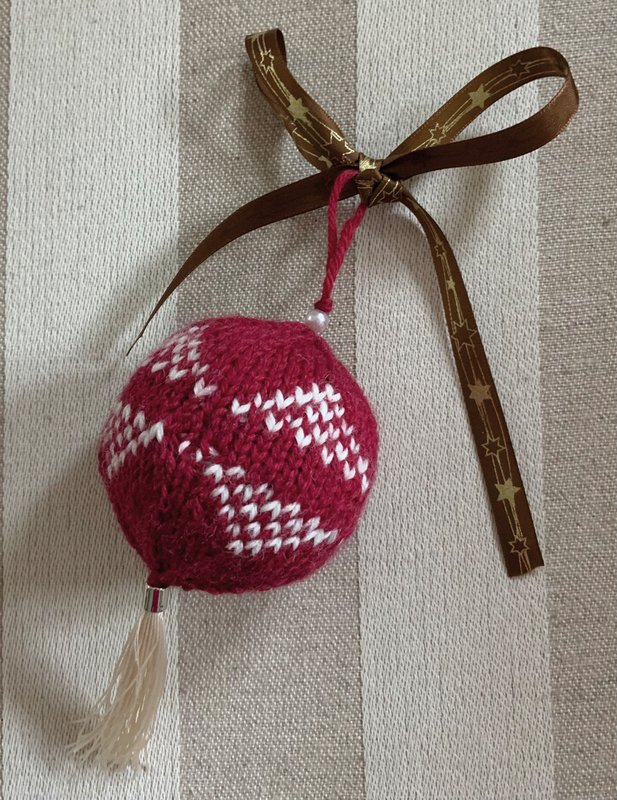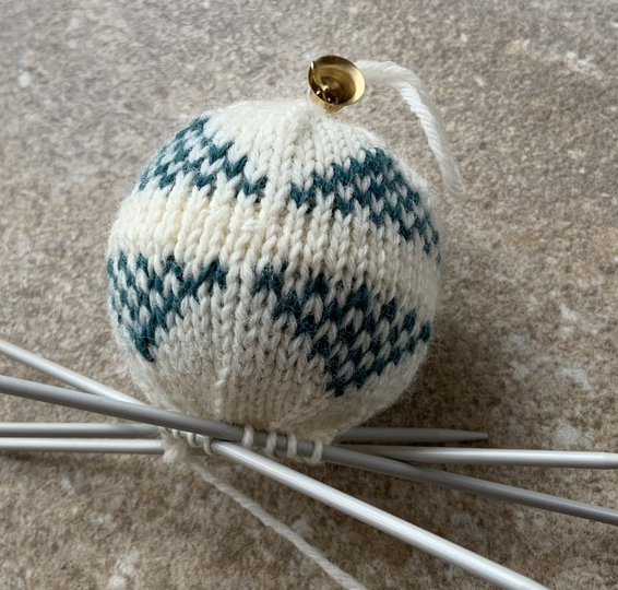 Anleitung, wie man eine Styroporkugel bestricken kann - hier mit einem Norwegermuster wie man es auch auf Pullovern findet.