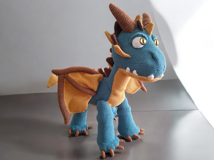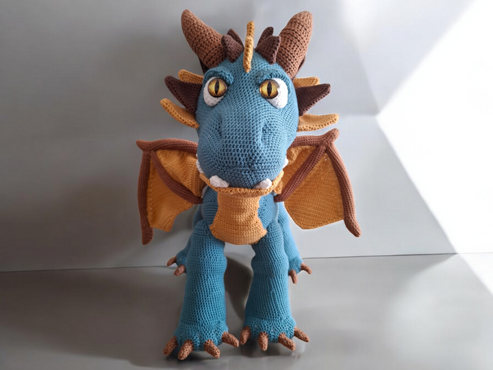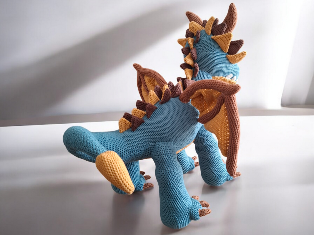 Der Fertige Drache wird ca. 48cm hoch und 50cm lang. Natürlich kann die Größe variieren, je nachdem ob man fest oder locker häkelt. Auch die Wahl der Wolle ist entscheidend. Ich selbst häkle mit Baumwollgarn 125m/50g (100% Baumwolle).