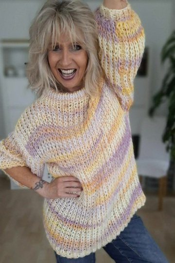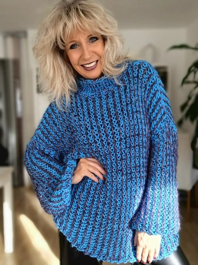 Der Flossy Pullover, etwas oversized, wird in einer luftigen Patentstrickart gestrickt.