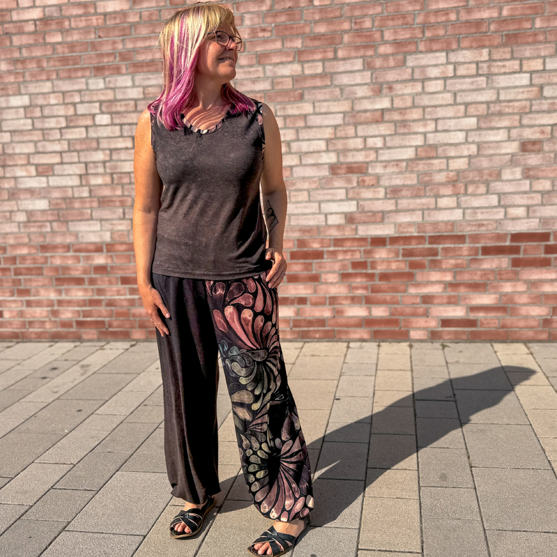Durch den höheren Sitz unter der Taille und dem weiten Bein, kann Arika je nach Materialauswahl, schick, elegant oder leger daher kommen.