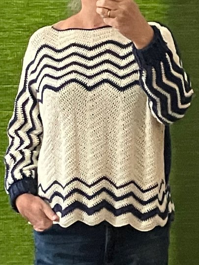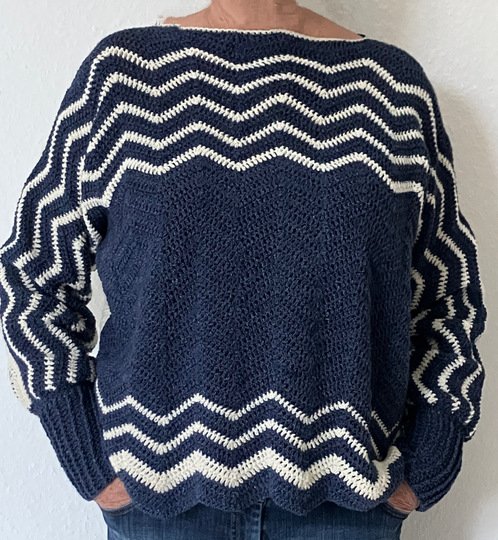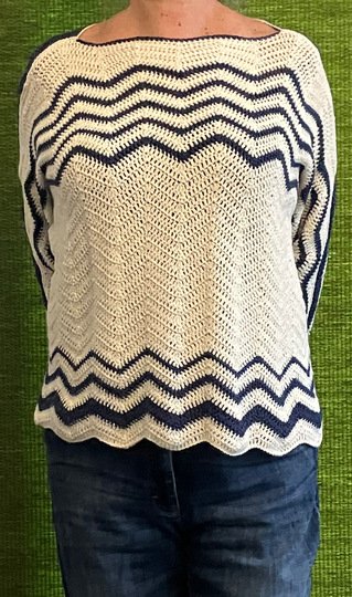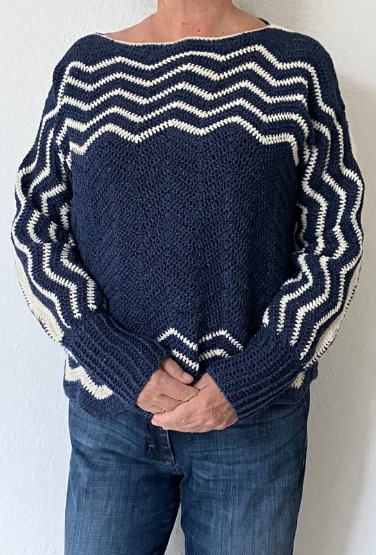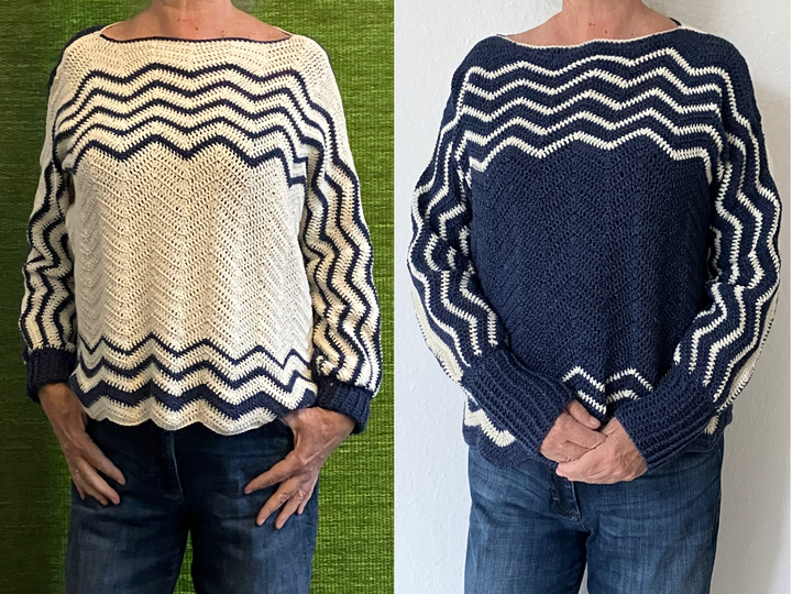 Dieser Pulli ist einfach zu häkeln, z.B. sind keine komplizierten Arm- oder Halsausschnitte dabei. Auch fortgeschrittene Anfänger kommen damit zurecht. Der Schnitt ist so gehalten, dass er vom Busen locker herab fällt. Das nenne ich dann „Bauchwegschummler“, weil er einfach eine gute Figur zaubert und super lässig daher kommt. Ich habe ihn als Wendepulli konzipiert: vorne weiß hinten blau, aber das war nur so eine Schnapsidee. Vorne und hinten die gleiche Farbe ist ebenso schön.