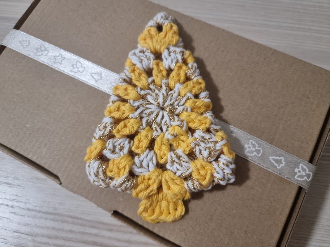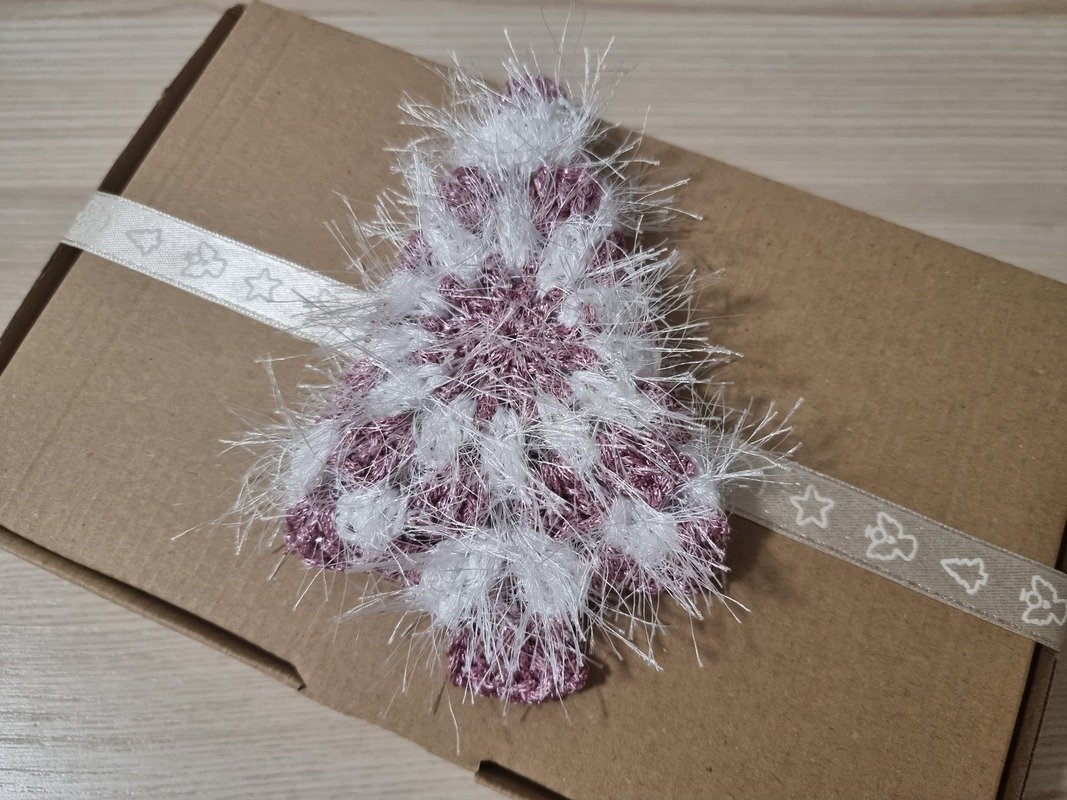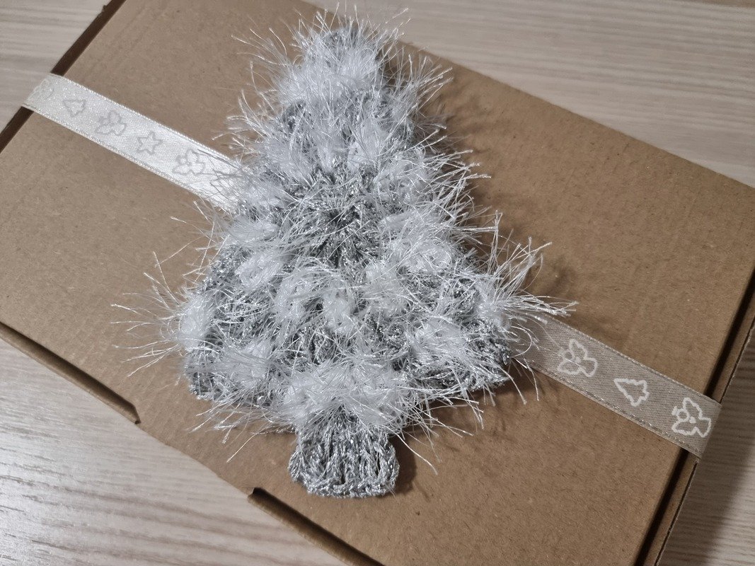 Bei den glatten Bäumchen ist es anders: Dort dient das silberfarbene, dünne Lurexgarn nur als Beilaufgarn zur weißen Baumwolle, um den schimmernden Effekt zu erzielen.