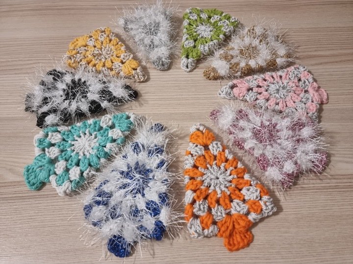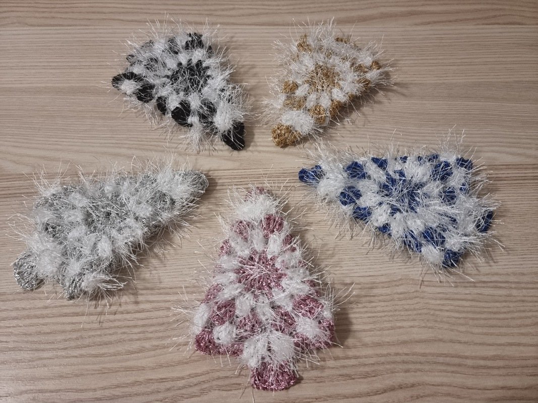 Das farbige Lurexgarn bei den flusigen Bäumchen wird ebenfalls solo gehäkelt. Diese Lurexgarne sind in der Regel etwas dicker und stabil genug, um ohne zusätzliches Basisgarn verwendet zu werden.