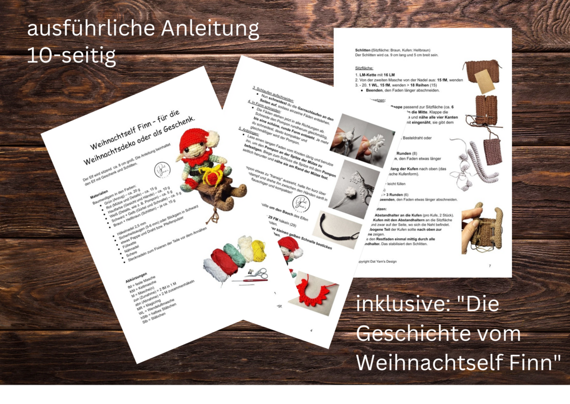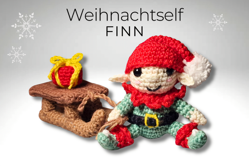 Mit dieser liebevoll gestalteten Häkelanleitung kannst du Finn den Weihnachtself samt seinem Schlitten und einem festlichen Geschenk nacharbeiten. Finn, mit seinem lustigen Grinsen, dem spitzen Hut und den typischen Elfenschuhen, bringt sofort weihnachtliche Stimmung in dein Zuhause. Der Schlitten und das Geschenk machen ihn zu einem besonderen Hingucker – perfekt für jede Weihnachtsdeko!