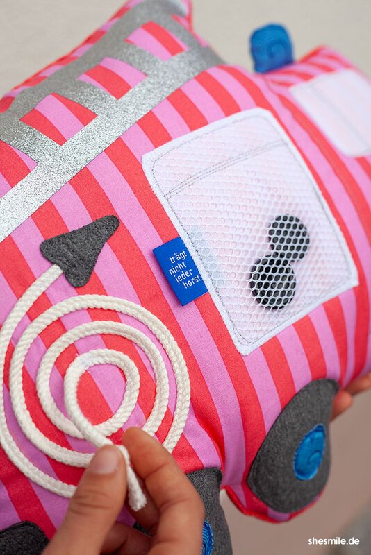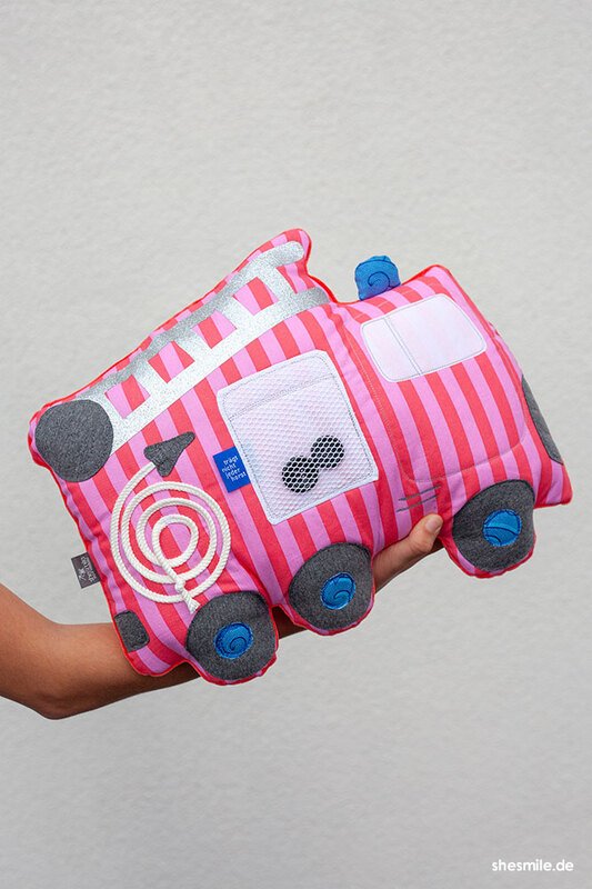 Nähanleitung und Schnittmuster gestaltet als PDF-E-Book für ein Feuerwehr-Kuschelkissen, dass auch als Spieluhr genäht werden kann.