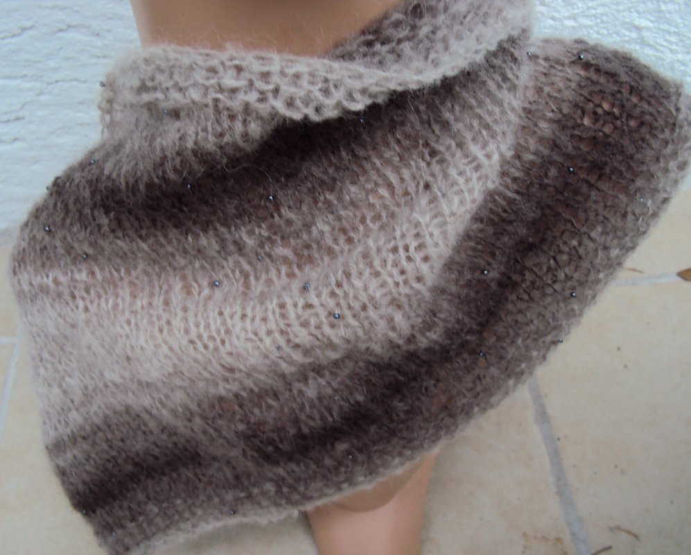 Dieser Cowl ist ganz einfach gestrickt. Er wirkt vor allem durch das interessante Garn, das zum einen einen schönen Farbverlauf hat, zum anderen sind noch kleine Perlchen eingearbeitet, die einen dezenten, aber sehr wirkungsvollen Glanz verleihen.