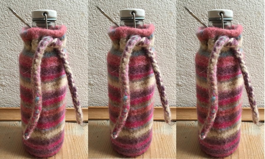 Selbstgemachte Hülle für eine Trinkflasche aus Glas für den täglichen Gebrauch.