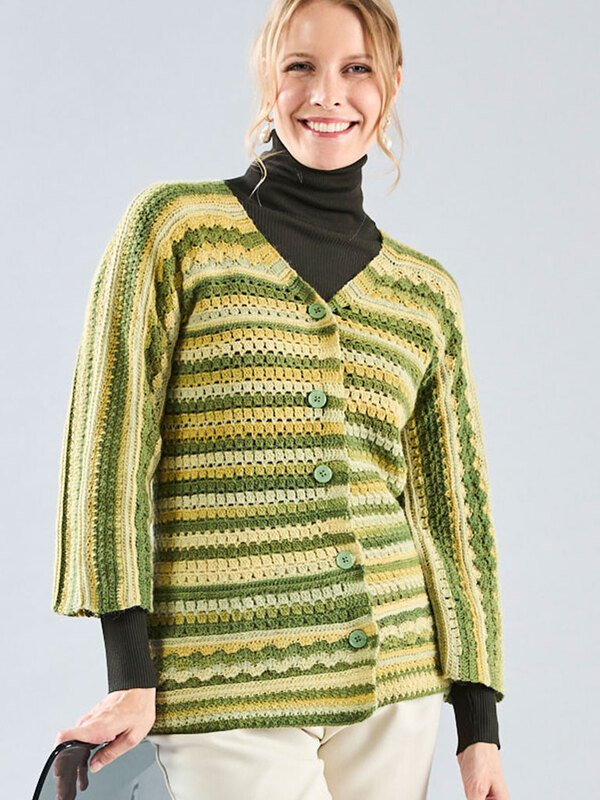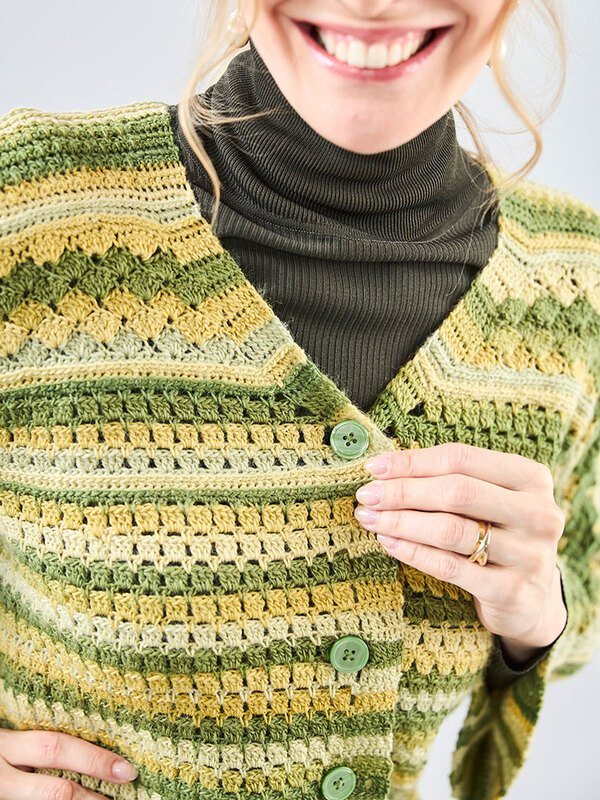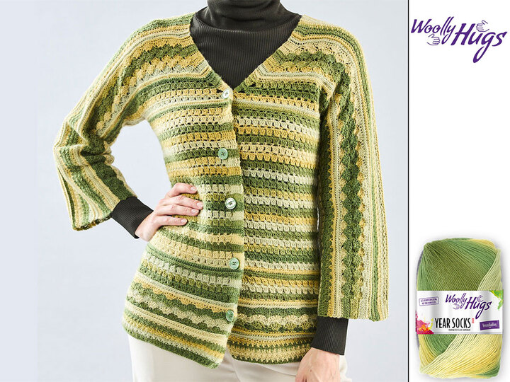 Schnell gehäkelt, super bequem! Mit Woolly Hugs YEAR SOCKS zauberst du dir im Handumdrehen eine coole Jacke. Keine lästigen Nähte, denn die einzelnen Teile werden einfach in einem Rutsch gehäkelt. Der tolle Mustermix sorgt für einen individuellen Look und macht die Jacke zum echten Hingucker.