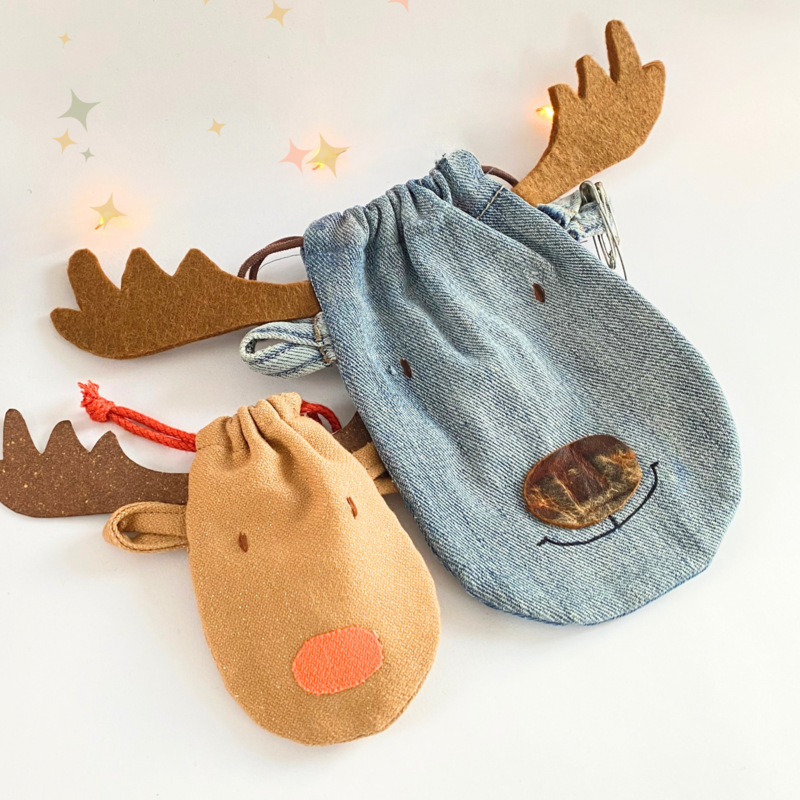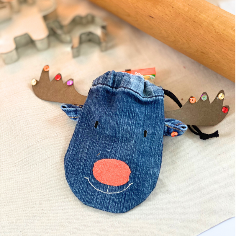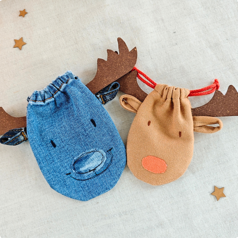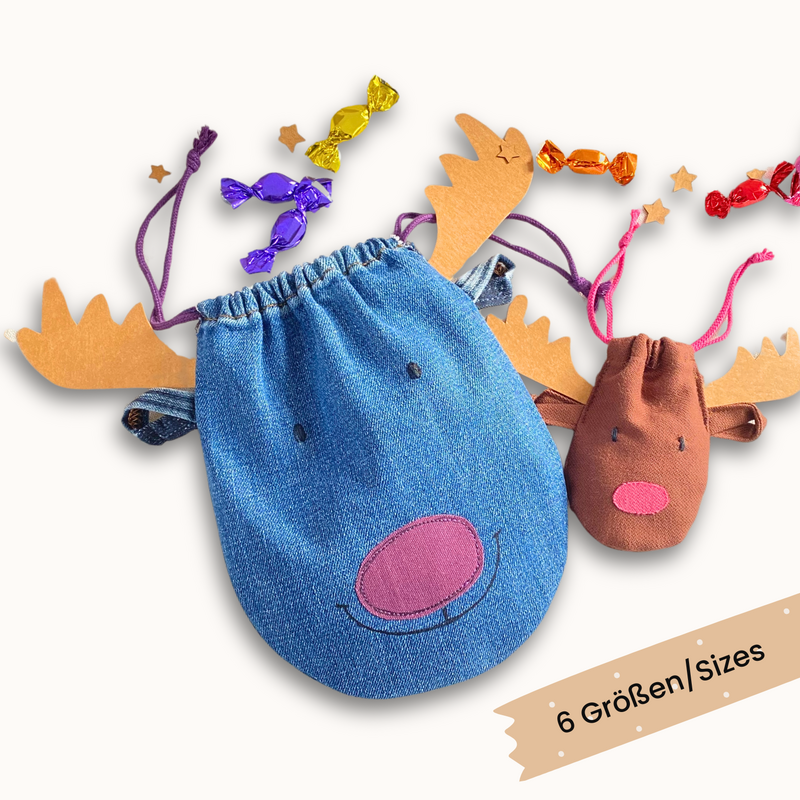 Du kannst sogar deine alte Jeans verwerten. Denn aus dem Hosensaum wird der Tunnelzug. (Jeans Upcycling wie ich es liebe: du musst den Tunnelzug nicht mal nähen, nur zuschneiden : ) Mit Stoffresten Weihnachtsdeko nähen – gelingt ganz einfach mit dem Elch Geschenkbeute Schnittmuster „RALF“