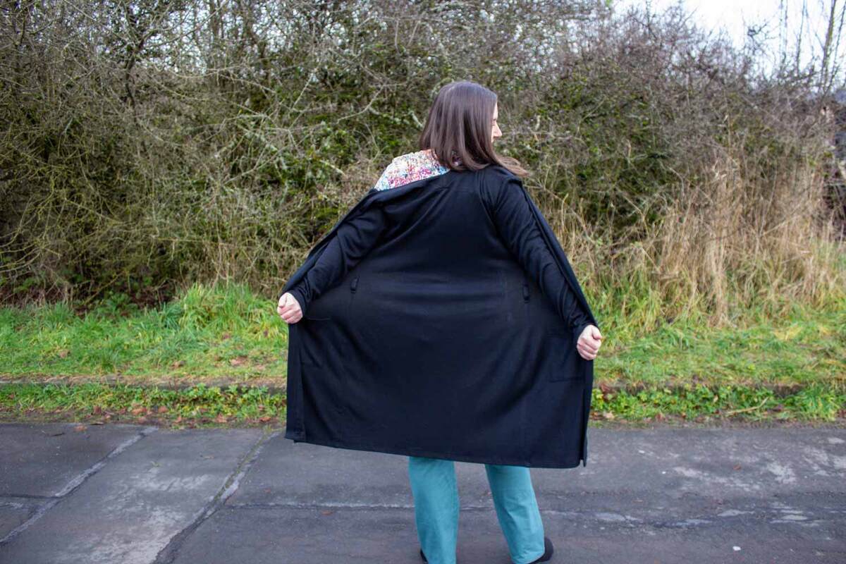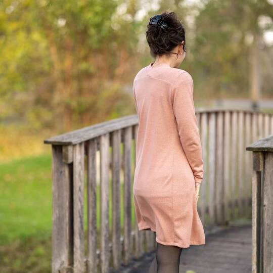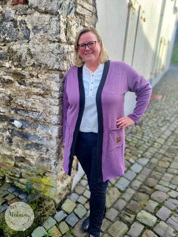 Dieser Schnitt für einen Longcardigan bzw. eine Strickjacke aus Strickstoffen mit ausgefallenem V-förmigem Rückenausschnitt und optionalen Taschen, optionalem Gürtel und Gürtelschlaufen, trägt den schönen Namen "Von Wärme erfüllt".