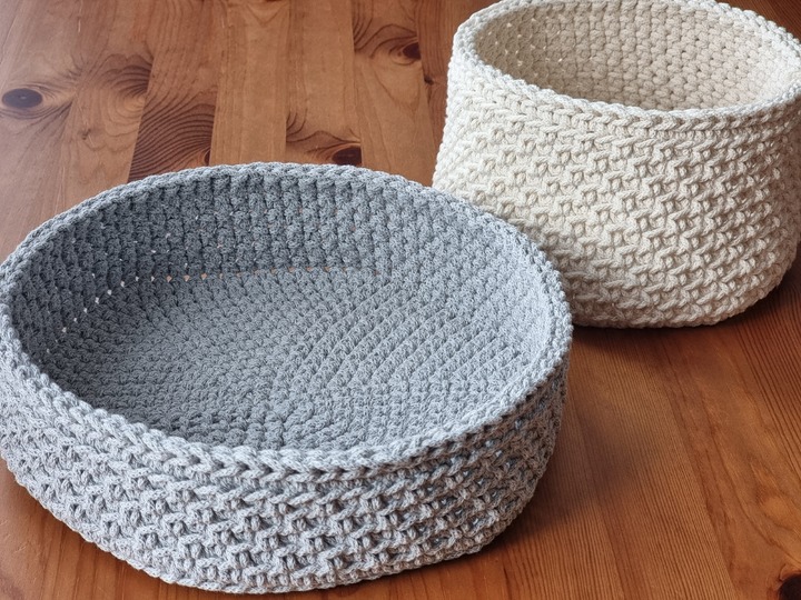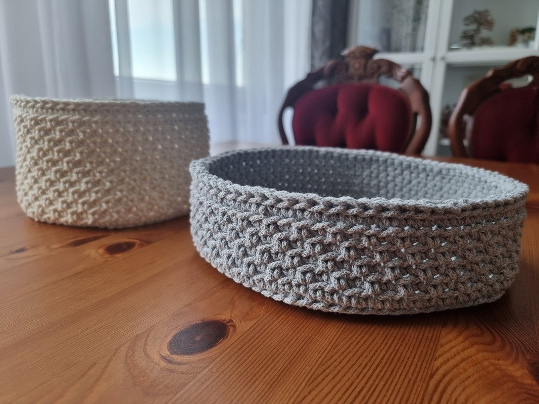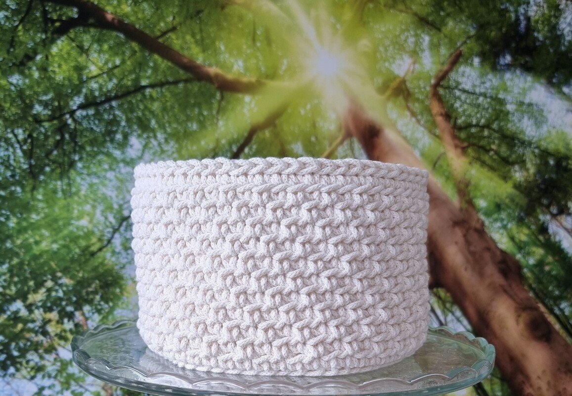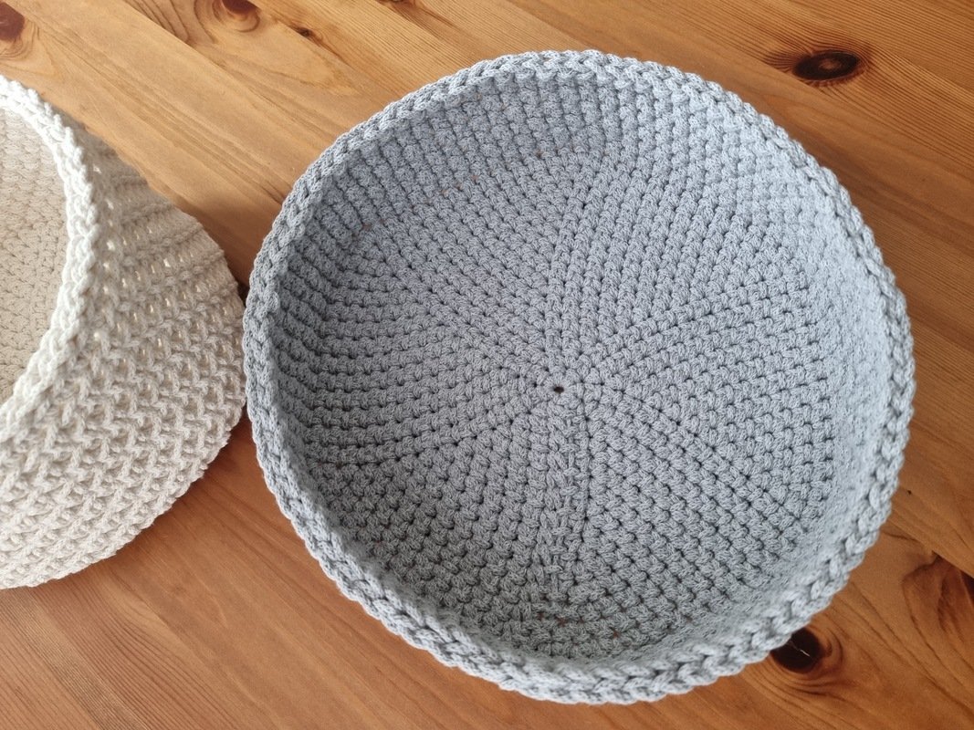 Für ein Korb: 1 Knäuel – Bobbiny Junior 3 mm, Braided Cord 100m. 100 % recycled Cotton. Hergestellt in Polen. Farbe: z. B. Natur oder Light Grey.