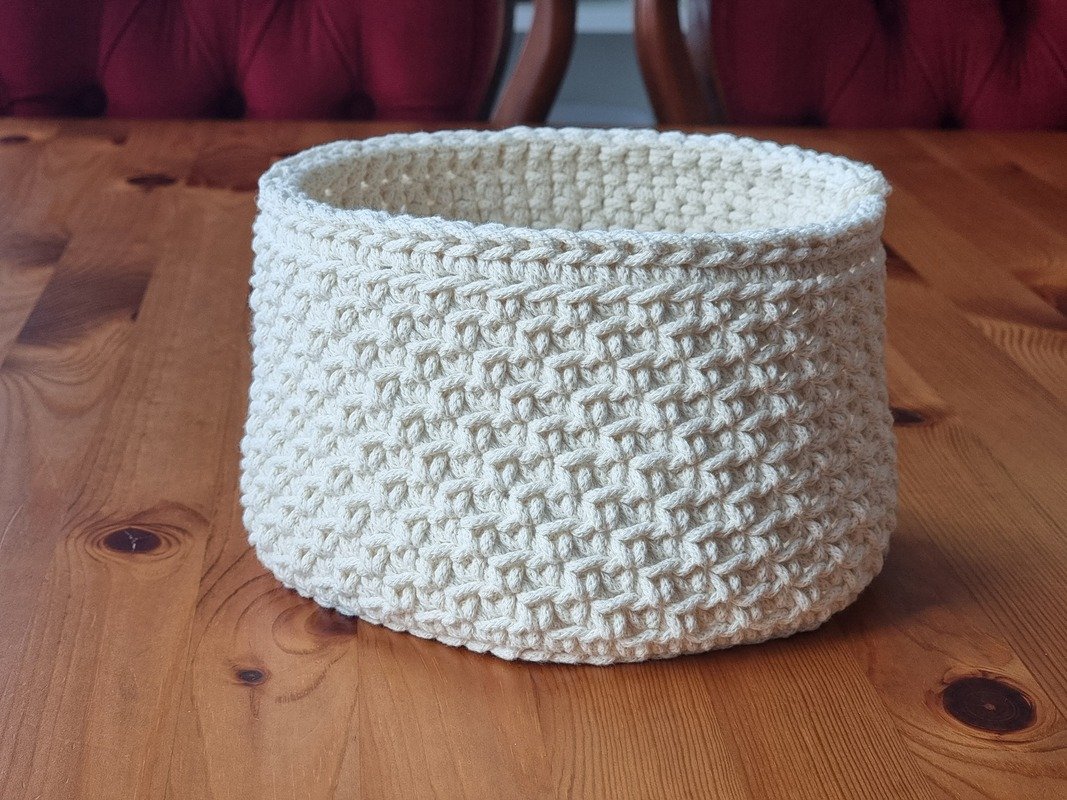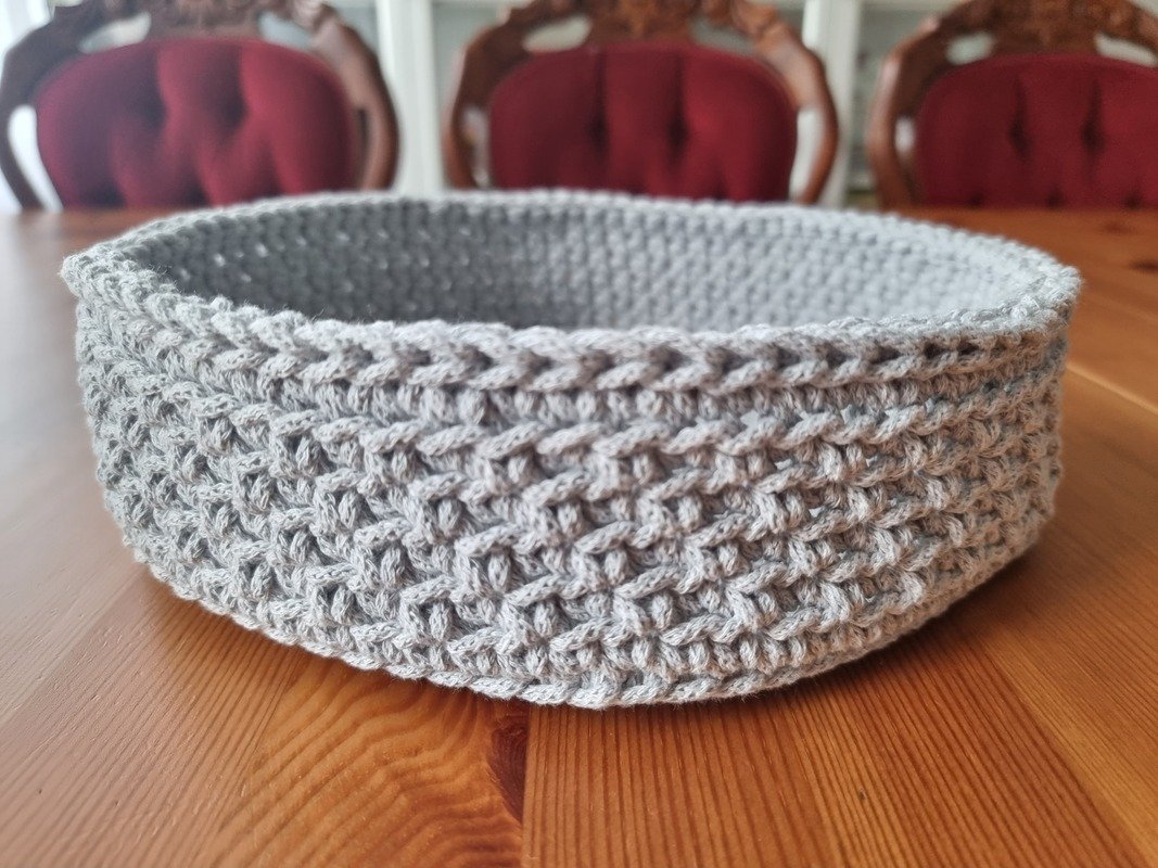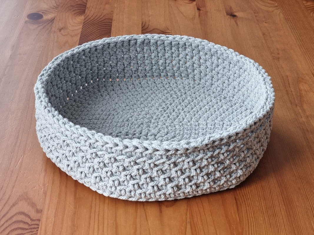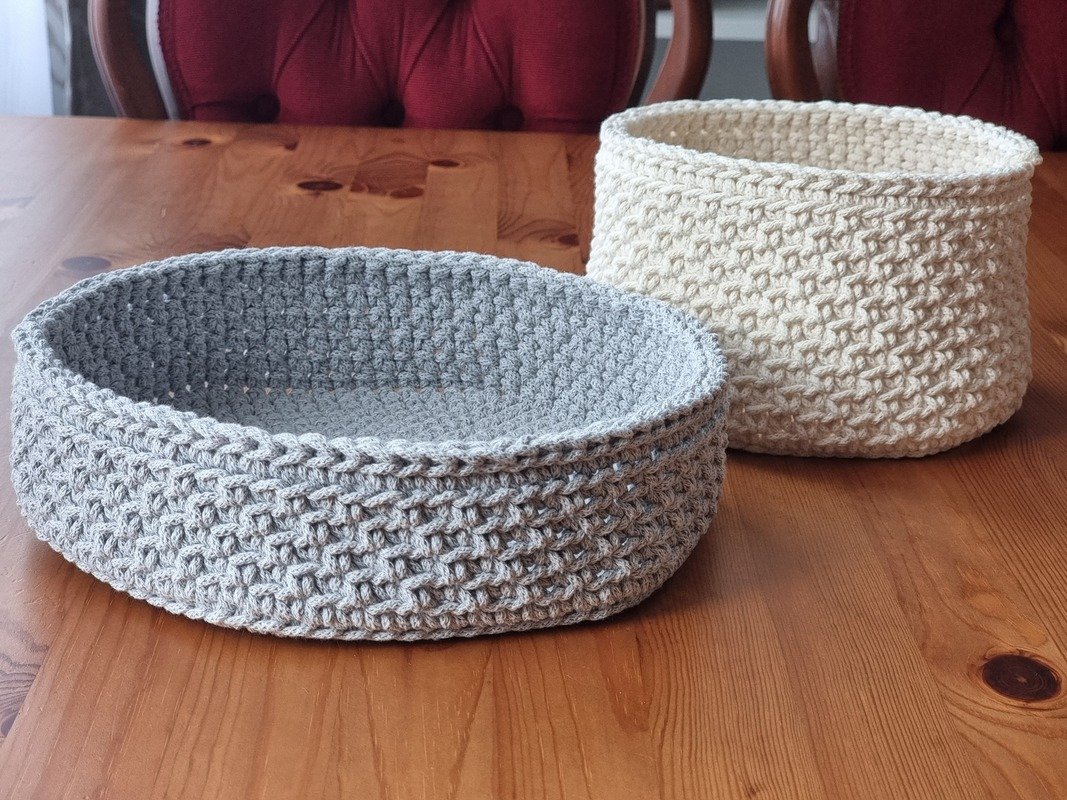 Für ein Korb: 1 Knäuel – Bobbiny Junior 3 mm, Braided Cord 100m. 100 % recycled Cotton. Hergestellt in Polen. Farbe: z. B. Natur oder Light Grey.