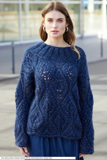 Der Pulli mit großflächigem Blatt-Ajourmuster ist nicht nur mollig warm, sondern begeistert schon beim Stricken. Beim Ajourmuster ist Konzentration gefragt, mit der genauen Strickschrift gelingt es aber gut. An den Seiten wird bis zum Armausschnitt kraus rechts gearbeitet; die breite Blende um den weiten Halsausschnitt ist mit Rippen gestrickt. Das flauschige Garn mit Glitzereffekt ist dank des hohen Mohair- und Seidenanteils (mit wenig Synthikbeimischung) zudem sehr kuschelig. Dazu ein Oversize-Schnitt, der viel Bewegungsfreiheit gibt. Die Anleitung kann für die Größen 40/42, 44/46 und 48/50 downgeloadet werden.