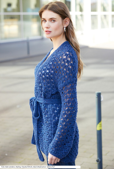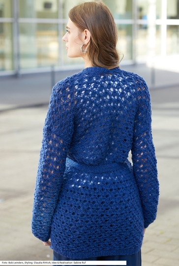 Dieser Cardigan kann lässig offen getragen werden oder mit einem Bindegürtel tailliert zum Einsatz kommen. Das einfache Ajourmuster geht leicht von der Hand. Alle Bündchen und die Vorderteilblende sind im Rippenmuster gestrickt. Jedes einzelne Teil ist ganz gerade geschnitten, die Ausschnittschrägung ergibt sich alleine dadurch, dass die Vorderteile zusammen schmaler als das Rückenteil sind. Gearbeitet wird mit einem dünnen Garn aus Schurwolle, Polyamid und Polyester in Dunkelblau mit Nadeln Nr. 5,5. Die Anleitung hierfür gibt es für die Größen 38/40, 44/46 und 50/52.