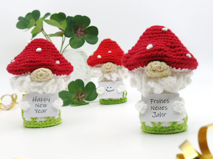 Mit 3.0 mm Nadel und DK Garn (z.B. Catania Grande, Puppets Lyric 8/8) wird der Pilz-Wichtel 8 x 10 cm groß (Breite x Höhe).