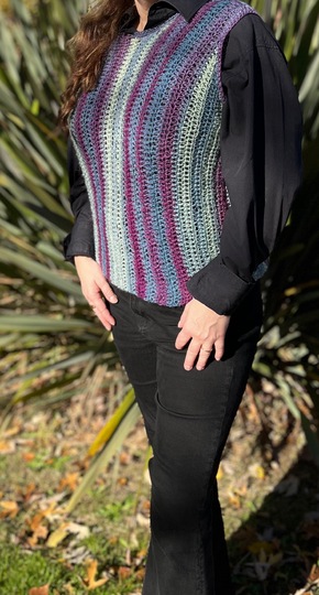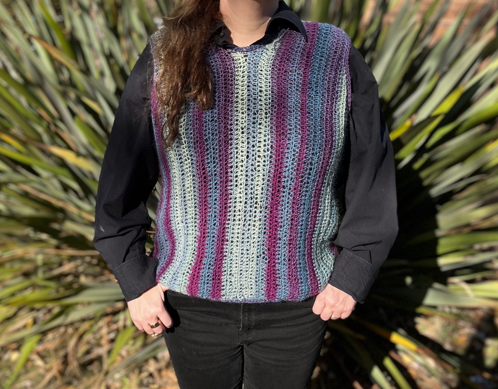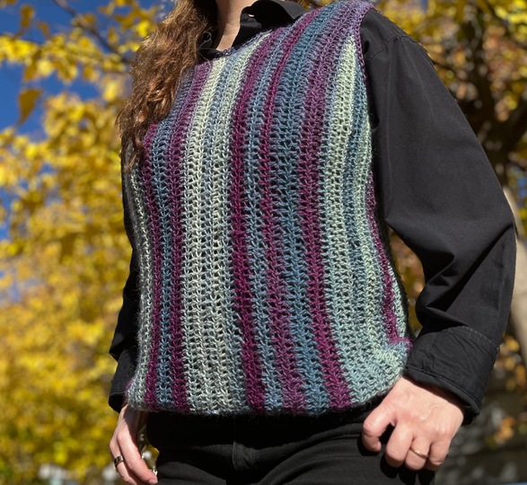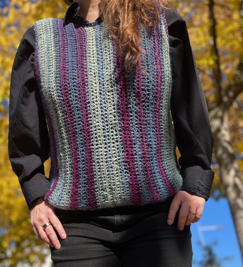 Dieser Pullunder ist perfekt für den Herbst. Hält dich schön warm und durch seine Farben holt er noch einmal den Sommer zurück.