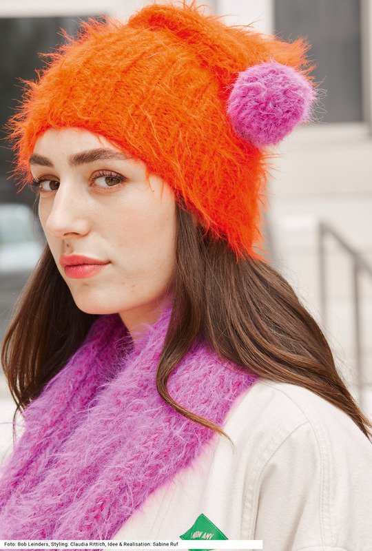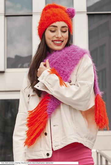 Ein Duo, das auch Strickneulingen leicht gelingt. Dazu braucht es nur ein weiches Flauschgarn und 6er-Stricknadeln. Gestrickt wird nur im Rippenmuster 2 Machen rechts, 2 Maschen links. Die Mütze und der Schal werden aus einem neuen Merino-Garn mit Polyamid-Beimischung in Fake-Fur-Optik gestrickt, das locker verzwirnt ist und so einen lässigen Franseneffekt erzeugt. In Kombination mit den leuchtenden Farben Pink und Orange ein echtes Fashion-Highlight. Die Anleitung ist für einen Schal mit 22,5 x 180 cm (ohne Fransen) und eine Mütze für 54 – 56 und 57 – 59 cm Kopfumfang.