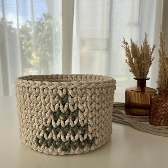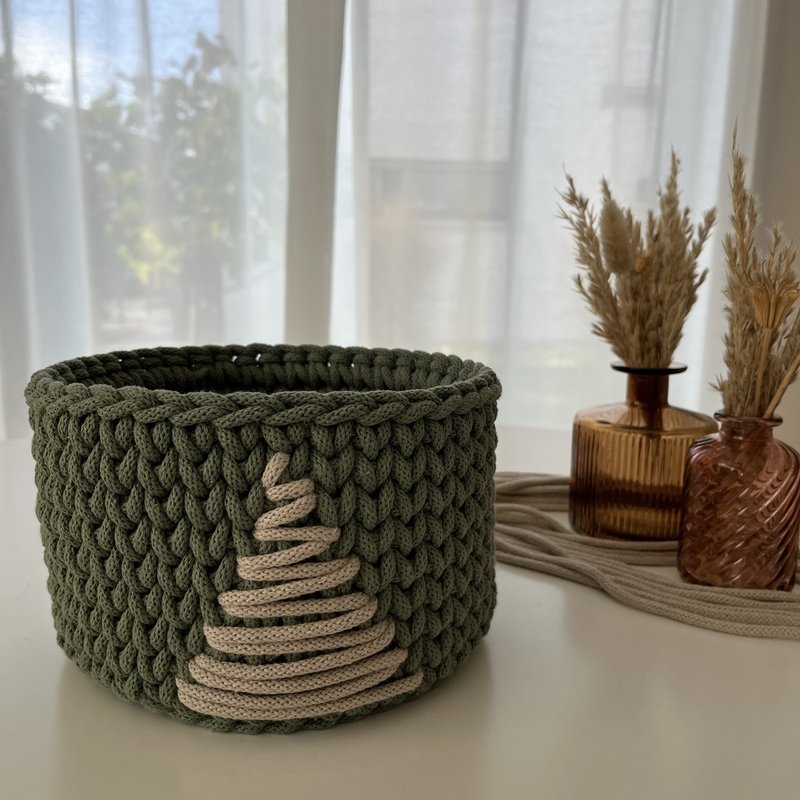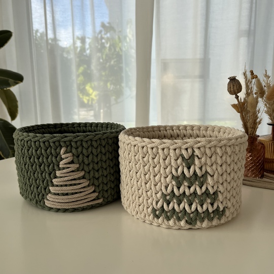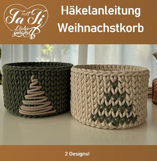 Häkel Dir zwei unterschiedliche Körbchen mit Tannenbaum-Design selbst! Mit dieser Anleitung ist das ganz einfach.