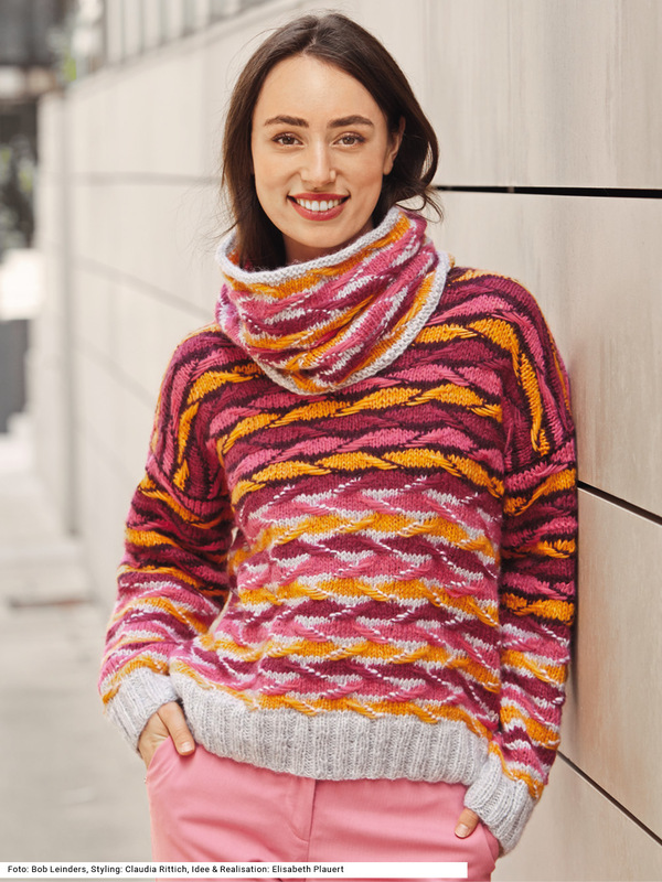 In diesem Set, bestehend aus Pulli plus Loop, wechseln sich insgesamt fünf Farben (Silbergrau, Aubergine, Fuchsia, Pink und Orange) in einem Hebemaschenmuster ab. Dabei bilden die auf der Vorderseite mitlaufenden, abgehobenen Farben das dynamische Streifenmuster. Der Clou: Der Pullover ist im oberen Bereich dunkler als unten, im passenden Loop wird der hellere Teil erneut aufgenommen. Alle Bündchen im Rippenmuster und der Rand des Loops in kraus rechts werden unifarbenen in Silbergrau gestrickt. Für beide Teile aus Alpaka-Baumwolle-Schurwolle-Garn gibt es eine Anleitung für die Größen 38/40 (44/46) und den Loop mit 34 x 60 cm Umfang.