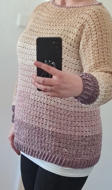 Ihr benötigt für diesen Pullover KEINE extra Ärmelbobbel, da er beinahe vollständig an einem Stück gehäkelt wird.