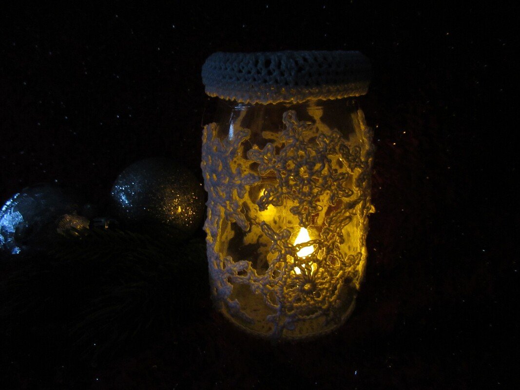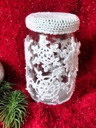 Das von mir verwendete Glas hat einen Durchmesser von 6 cm und ist (ohne Deckel) 10 cm hoch. Du kannst aber Gäser in jeder beliebigen Größe verwenden. Die Schneelocken haben, mit dem angegebenen garn gehäkelt Durchmsser zwischen 4 und 8 cm. Mit dickerem Garn gehäkelt, werden sie natürlich etwas größer.
