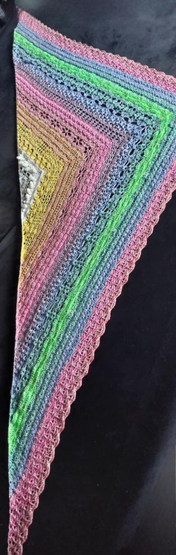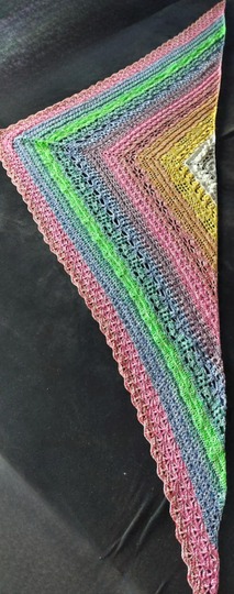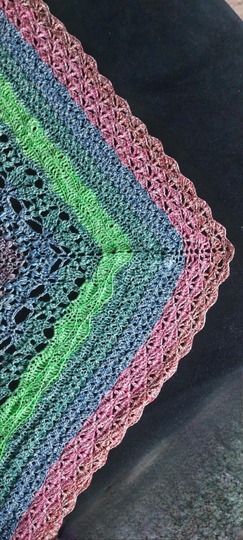 Das flache Dreieckstuch JaCal war ursprünglich ein JahresCAL (Crochet ALong= gemeinsames Häkeln) in meiner Facebook-Gruppe „Evi´s Maschentruhe“. Wir haben jeden Monat gemeinsam 4 Reihen Muster mit verschiedensten und für den Monat passenden Mustern gehäkelt.