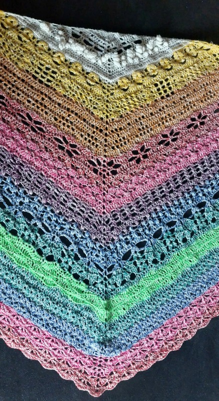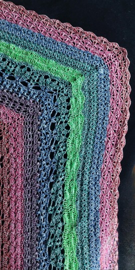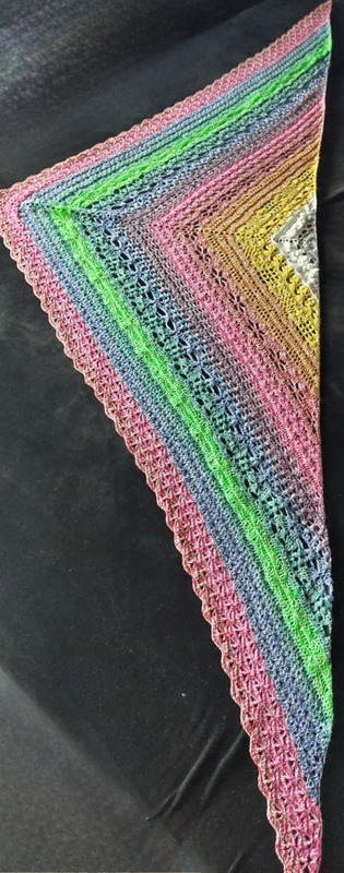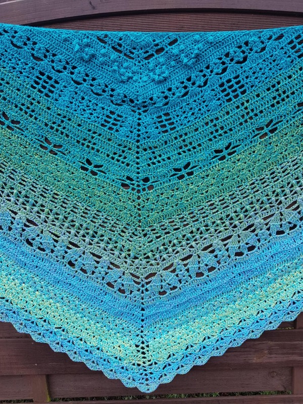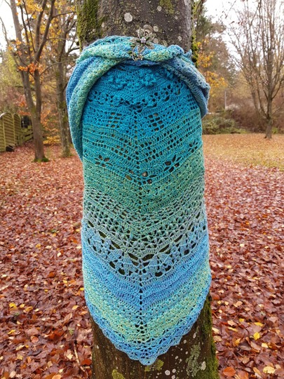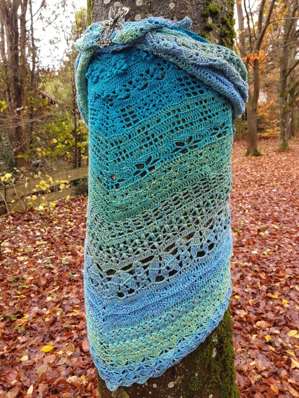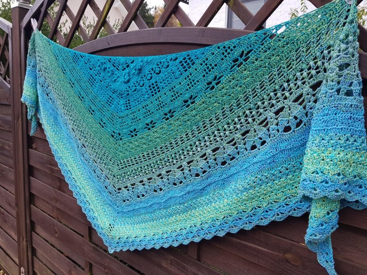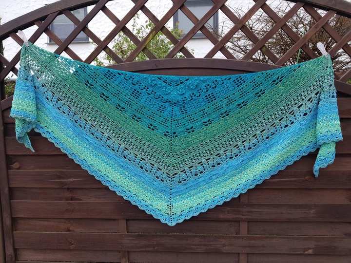 Es kann mit jedem gewünschten Garn gehäkelt werden, ich würde dazu einen Farbverlaufsbobbel mit 1200 m empfehlen. Ich habe für mein Tuch den Bobbel Herr der Gezeiten von Steffi´s Wollbobbel verwendet.