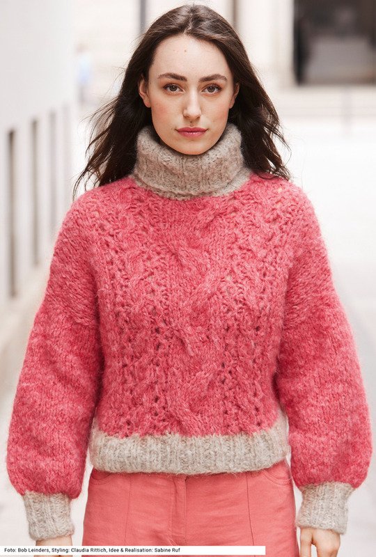 Dieser Pullover aus flauschigem, körnigem Garn liegt weich auf der Haut, zugleich ist das Modell sehr leicht; das liegt an der Mischung aus Polyacryl, Mohair, Schurwolle und Polyamid. Die verschiedenen Zopfmuster werden flankiert von schmalen Ajourstreifen, ansonsten wird glatt rechts gearbeitet. Die Bündchen und der Rollkragen sind im 2/2-Rippenmuster in Beige gestrickt, was einen tollen Kontrast zum erdbeerroten Hauptteil bildet. Ein oversized geschnittener Pulli, der das Zeug dazu hat, ein Lieblingspulli zu werden. Die Anleitung dazu gibt es für die Größen 38/40, 42/44 und 46/48.