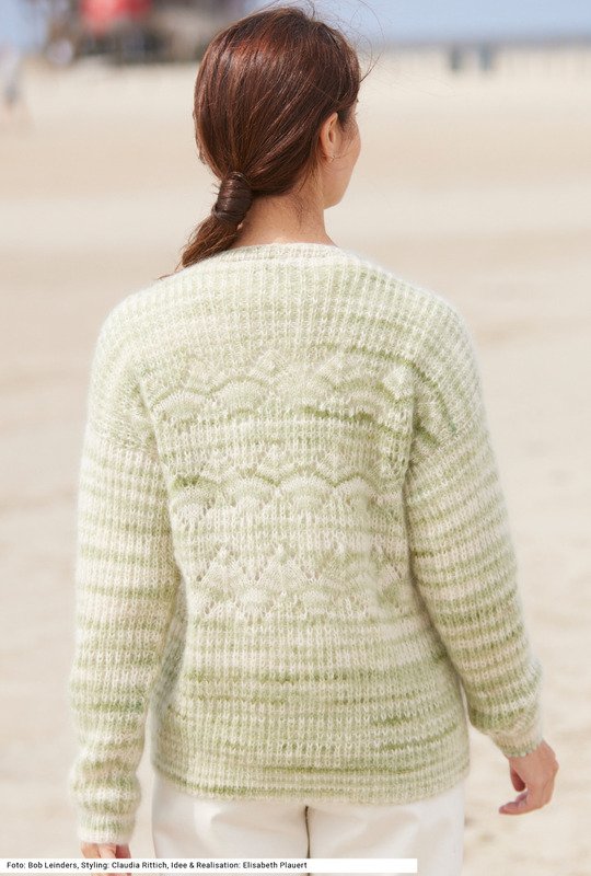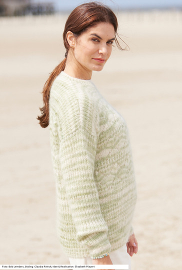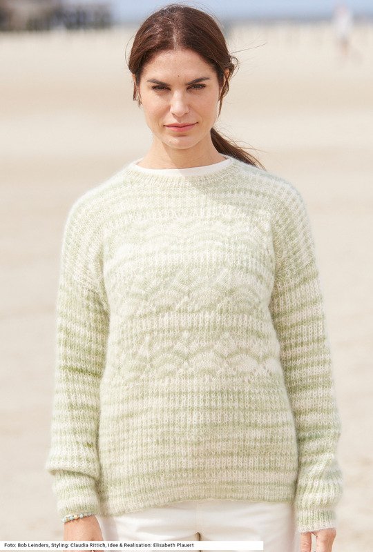 Ein edles leichtes Garn aus Mohair und Seide in einem zurückhaltenden grün-beige melierten Farbverlauf wird hier zu einem klassisch geschnitten Pullover verarbeitet. Das Halbpatentmuster wird im Brustbereich als Ajour-Patentmuster gestrickt. Die gerade Schnittführung erzeugt überfallende Schultern und die weiten, oben ebenfalls geraden Ärmel erleichtern das Zusammennähen der Teile. Der Bund an Saum und Ärmeln sowie die Halsausschnittblende sind im Rippenmuster eins rechts, eins links gestrickt. Die Anleitung dazu kann für die Größen 38/40 und 44/46 downgeloadet werden.
