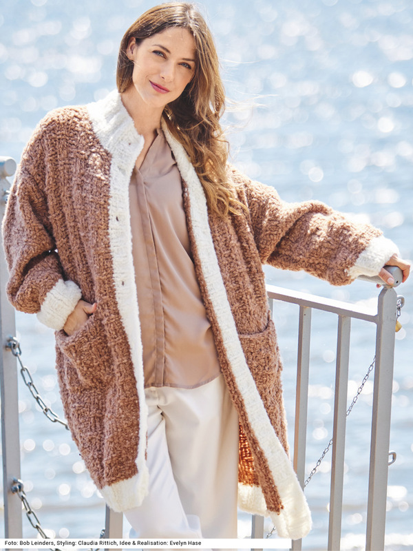Dieser knielange Mantel in einem dunklen Camel-Ton mit ecrufarbenen Bündchen und Blende wärmt, bringt aber kaum Gewicht auf die Waage. Das liegt am voluminösen Flauschgarn aus Schurwolle und Polyamid. Praktisch sind die geräumigen, eingearbeiteten Taschen mit Taschenbeuteln, die Schlüssel & Co. beherbergen. Ein Strukturmuster aus rechten und linken Maschen ist einfach zu stricken. Die ecrufarbenen Ränder werden 2 rechts, 2 links gearbeitet. Gerade eingesetzte Ärmel erleichtern das Einnähen. Eine Anleitung hierfür gibt es für die Größen 40/42, 44/46 und 48/50.