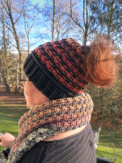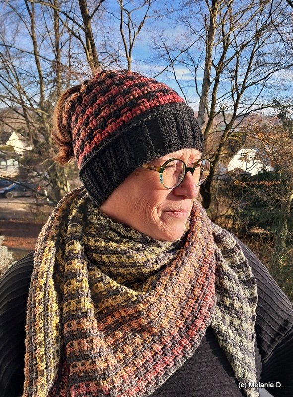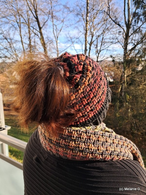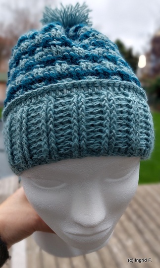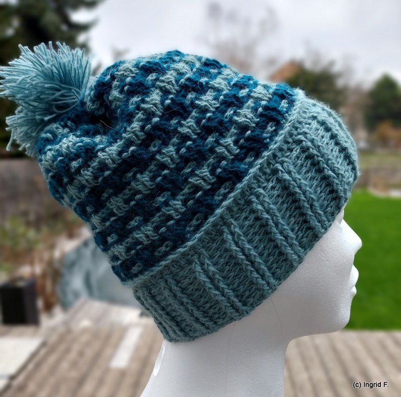 Mein Verbrauch für das Haubi im Titelbild (Erwachsenengröße) waren 90 g Merino/Polyacryl, 3-fädig von Funny Hooks Bobbel