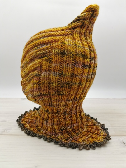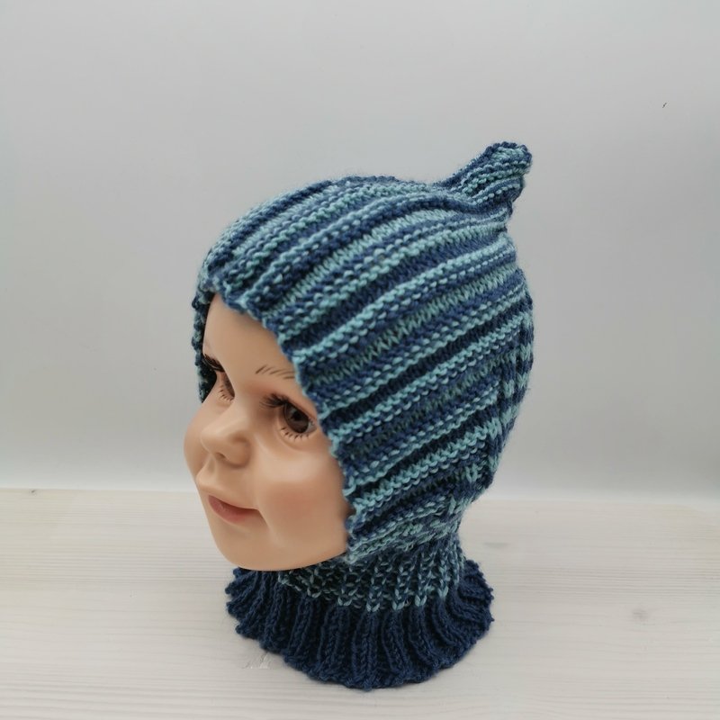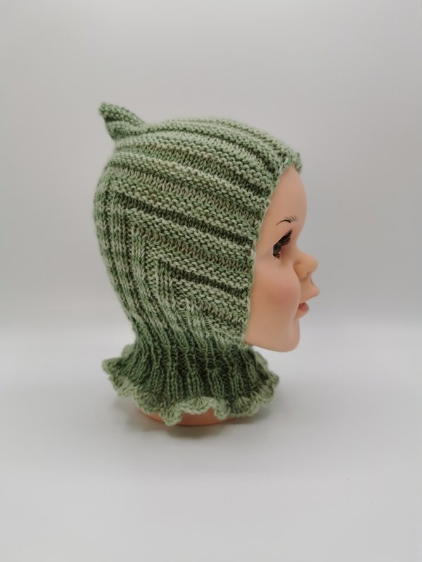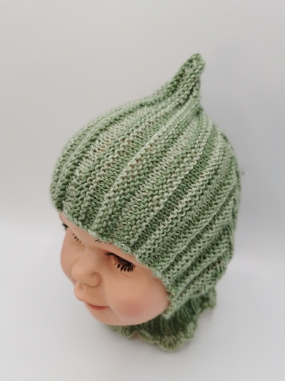 Es handelt sich um eine Mitwachs-Mütze. Durch das Rippenmuster zieht sich die Mütze zusammen und ist sehr dehnbar. So passt sie sich der Kopfform an und wächst mit.