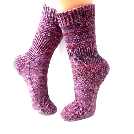 Diese Anleitung enthält Charts, die für jede Größe angepasst wurde. Der rechte und linke Fuß wird unterschiedlich gestrickt. Hierfür gibt es jeweils eine seperate Anleitung. Bei diesen Socken zieht sich durch das Muster nichts zusammen, so das die übliche Nadelstärke eingehalten werden kann. Der Schaft ist etwas höher, als bei den üblichen Socken. Diese Anleitung ist für fortgeschrittene Strickerinnen geeignet. Sie enthält verkreuzte Hebemaschen, sowie verschrenkt gestrickte linke und rechte Maschen. Gestrickt wird vom Bund abwärts.