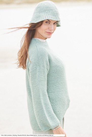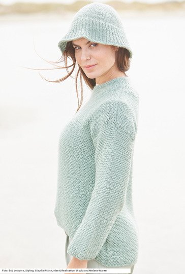 Pullover und Hut aus reiner Alpakawolle. Das einfache Schlingenmuster des Pullis entsteht durch Hebemaschen, bei denen der Faden auf der Vorderseite weitergeführt wird. Eine abgerundete Unterkante am Vorderteil und ein dadurch längeres Rückenteil sowie die I-Cord-Blenden an den Rändern verleihen dem ansonsten schlichten Pulli das gewisse Etwas. Dazu gibt es einen klassischen Hut mit Krempe, der mit Sprühstärke in Form gebracht wird. Die Hutkrempe ist im Rippenmuster und ansonsten glatt rechts gearbeitet. Die Anleitung für das Set gibt es in den Größen 36/38, 40/42 und 44/46, Hut: 52 – 54 und 55 – 57 cm Kopfumfang.