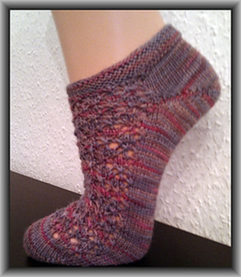Little Jacky´s sind zwei verschiedene Kurzsocken mit Lochmuster, die in jeder Größe gestrickt werden können. Variante 1 ist romantisch verspielt, während Variante 2 sportlich chic wirkt. Beide Varianten werden in der Anleitung separat beschrieben, können aber auch nach eigenem Geschmack variiert werden. Eine Größentabelle mit allen Vorgaben ist in der Anleitung enthalten. Gestrickt wird vom Bund abwärts. Es wird hier eine Bumerangferse gearbeitet. Für Anfänger gut geeignet. Die Anleitung wurde von mir entworfen und untersteht dem Copyrght. Bitte nur für den Privatgebrauch verwenden! Größe/Maße/Gewicht Von Gr. 24-45 Größentabelle mit allen wichtigen Angaben in der Anleitung. Verwendete Materialien Zum nachstricken dieser Anleitung benötigt man ein Nadelspiel Gr. 2,5 Ca. 50gr. Sockenwolle (210m/50gr.)