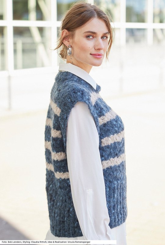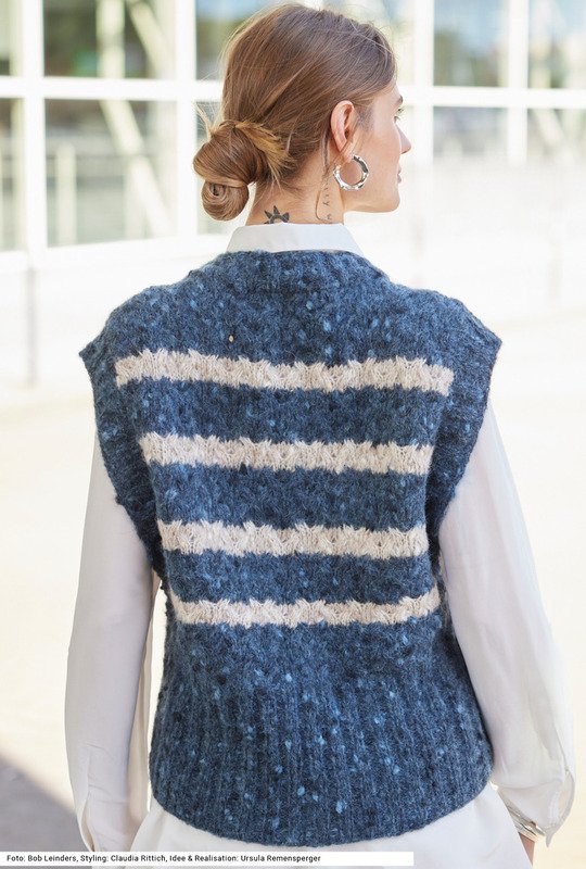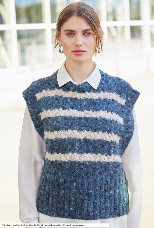 Dieser Pullunder mit Allover-Zopfmuster wird aus einem Color-Garn mit Tweedoptik gestrickt, dessen kerniger Charakter vor allem im dunklen Jeansblau besonders zur Geltung kommt. Ins Auge fallen die hohen, weiten Armausschnitte und der hohe Bund. Bund und Ärmelblenden werden im Rippenmuster gearbeitet. Für die Verzopfungen werden in den Reihen davor Maschen abgehoben, die dann verkreuzt werden – der Effekt dabei: Die Streifen sind nicht streng gerade, sondern die Farben ziehen sich in den folgenden Streifen hinein. Das jeansblaue und beige Garn besteht aus Schurwolle, Alpaka und Polyamid. Die Anleitung ist für die Größen 36/38, 40/42 und 44/46.