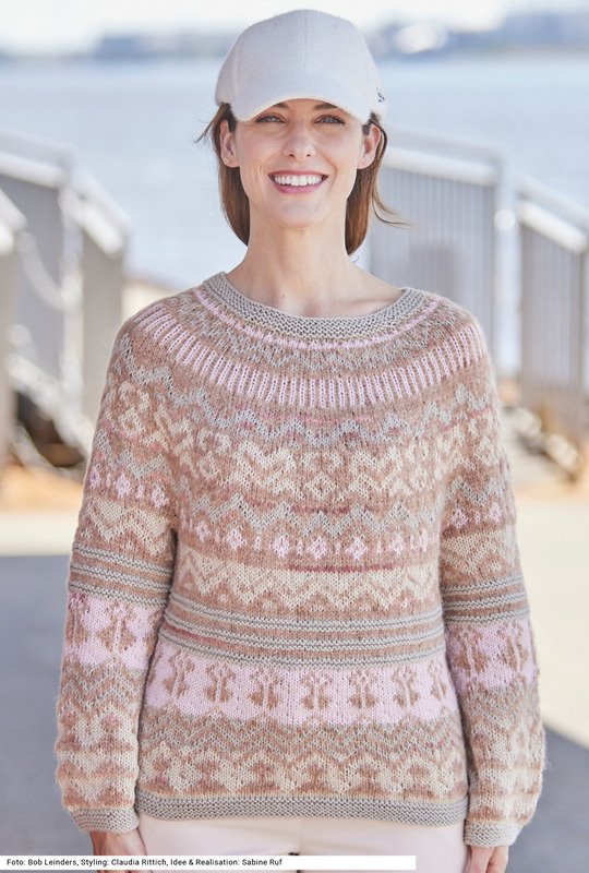 Dieser Passen-Pullover macht Fans des nahtlosen Strickens glücklich! Er wird von oben nach unten in Runden gearbeitet. Spannend ist auch die Kombination zweiter Qualitäten: ein glattes Garn und ein Flauschgarn. Das glatte Garn ist aus reiner Schurwolle, das flauschige besteht aus Wolle, Polyamid, Alpaka und Polyacryl. Neben den glatt rechten Jacquardmustern in Grège, Sand und Puderrosa wird auch ein zweifarbiges Längsstreifenmuster und unifarbene Bereiche in Beige sowie kraus rechte Streifen in Grège gearbeitet. Die Anleitung ist für Größe 36/38 vorhanden.