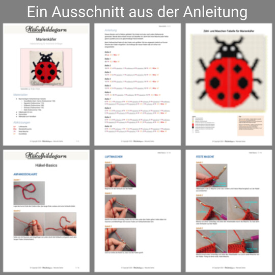 In der Anleitung wird keine Häkelschrift verwendet. Die Maschentabelle ist so gestaltet, dass das Häkeln durch fertig gezählte Maschen erleichtert und beschleunigt wird. Es wird in Reihen und festen Maschen gehäkelt.