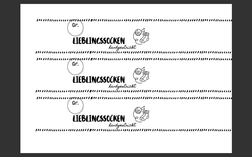 Banderolen für gestrickte Socken zum selber Ausdrucken. Es ist ein pdf im DIN a4 Format. Die Banderolen sind dreimal auf der Seite zum Ausdrucken. Sie können einfach ausgeschnitten werden. Dazu dient eine Borduere, die unten und oben die Banderole abschliesst. Es ist ein Button vorhanden um die Grösse einzutragen.