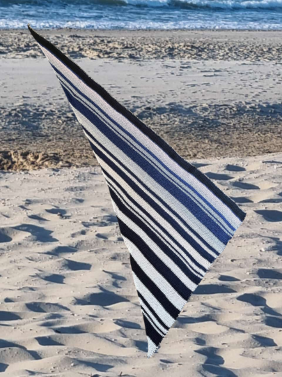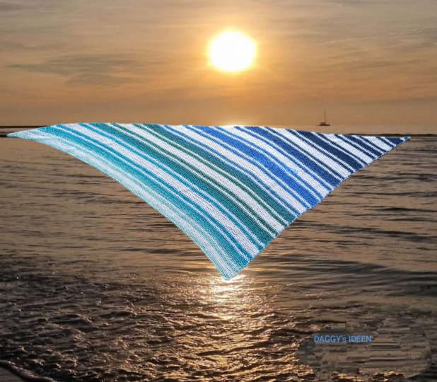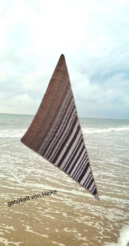 Das Tuch „dobbelen 2.0“ (niederländisch würfeln) ist ein asymmetrisches Dreieckstuch und wird es aus zwei Bobbeln (Farbverlaufsgarn) gehäkelt. Die Anzahl der zu häkelnden Reihen wird gewürfelt, daher hat das Tuch auch seinen Namen.